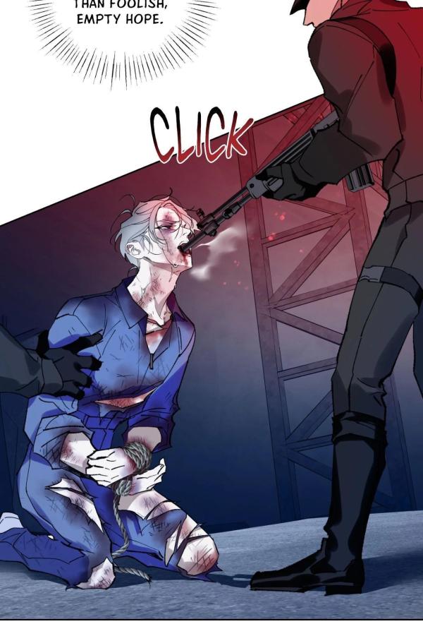 the tattered and ripped fabric of his clothes, his pretty bruised face, and the gun in his mouth…
