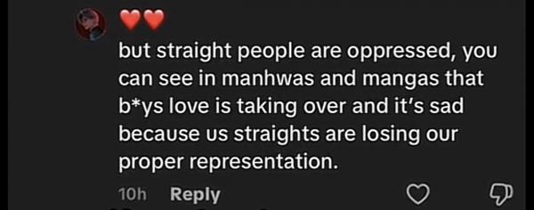 yeah no, that’s not true. Straight stories are literally everywhere; manhwa, manga, novels, movies, you name it. BL is still a small niche compared to the massive amount of straight content. Acting like straight people are ‘losing representation’ is just ignoring reality.