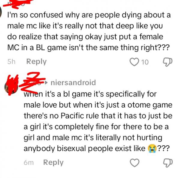 I'm generally so confused all I said was that I don't see why would be a problem to have male MCs in otome games and this random girl tried to explain something to me I guess or prove me wrong? But i honestly don't understand how what I said was so wrong like was it???