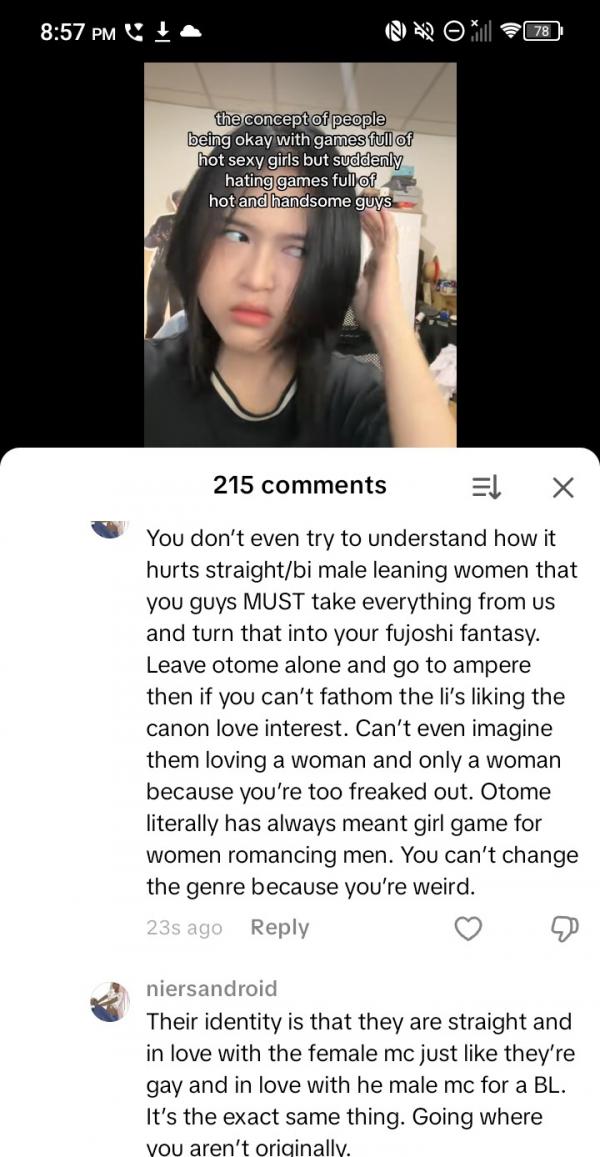 The most frustrating comment is from the bisexual guy that made it about fujoshi and how they "don't grasp that many bisexual men lean more toward women." They are acting as if loving the opposite sex is not the easiest thing you can do, and somehow he is acting oppressed about it by fujoshis. From what I have seen, the people who keep asking for otome games to have male MCs are queer men. Telling them to shut up because they have BL is stupid. BL is not made for you to self-insert; the MC will have a story of his own and a character of his own. Otome games, on the other hand, most of the time they are for self-inserts. I try to play bishoujo games, but I hate how they force me to be male every time.